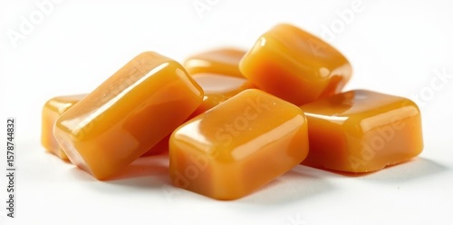 Golden brown caramel candies, glossy sheen, isolated on white , background, butterscotch