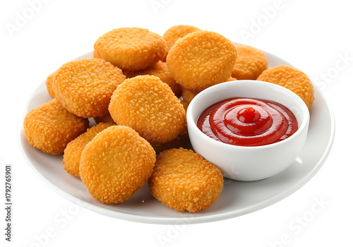 Golden brown chicken nuggets with ketchup dip isolated on transparent background