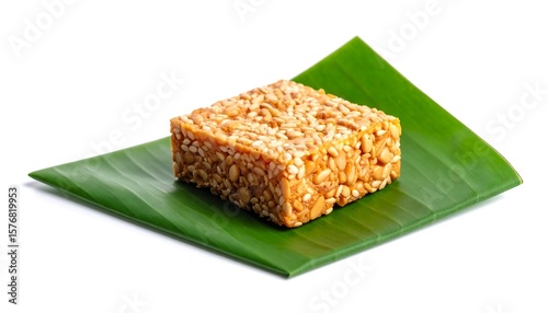 Golden Brown Peanut Bar on a Vibrant Green Banana Leaf with White Background