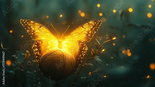 Golden Butterfly Resting on Orb in Dark Flora