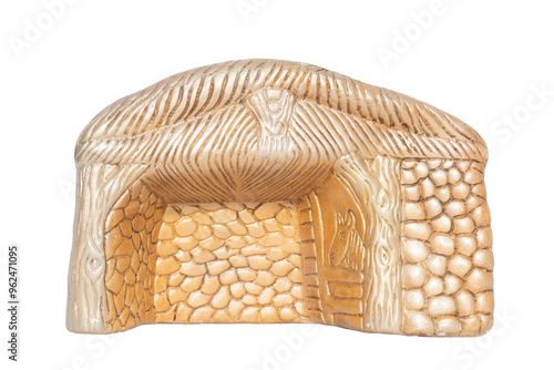 Golden ceramic figure of a manger. Birthplace of Jesus. Simple structure of a stable.