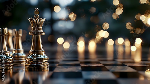 Golden chess queen piece on board with blurred bokeh lights creating dramatic atmosphere. Strategic game concept with focus on leadership piece.