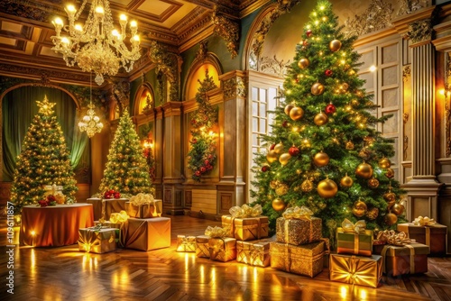 Golden Christmas Elegance: Luxurious Gifts & Pine Decor - Architectural Holiday Photography