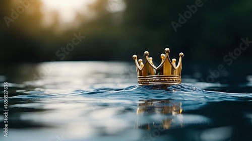 Golden crown floating on rippling water surface with sunlight creating magical atmosphere, royal symbol emerging from blue depths. Perfect for fairy tale concepts.