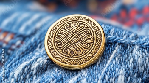 Golden Decorative Button with Intricate Design on Fabric Surface
