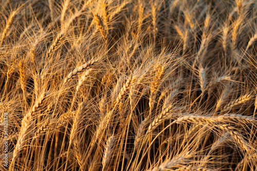 Golden ears of barley, summer in the harvest season, in the fields of Russia in the Rostov region. Dry yellow grains close up