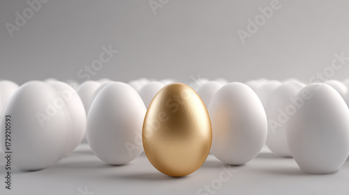 Golden egg among white eggs on clean background, concept of special talent and leadership.