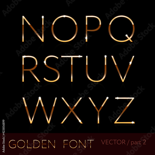 Golden font style. Metallic alphabet. Part 2. Shinning latin letter isolated on dark background, English abc with glowing effect. Vector editable illustration