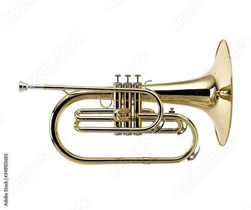 Golden French horn , Horn, Brass Music Instrument Isolated on White background