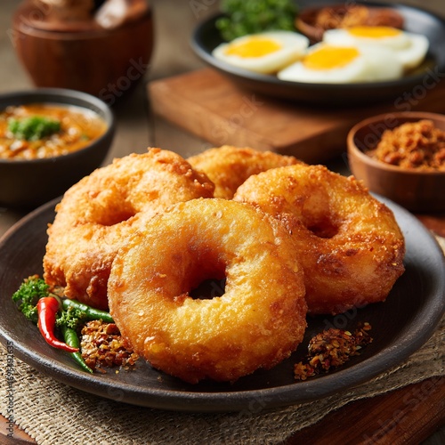 Golden Fried Doughnut Delights with Complementary Dishes on a Rustic Table Setting Display