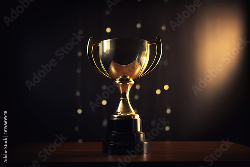 Golden glowing trophy cup on dark background. Concept of success and achievement