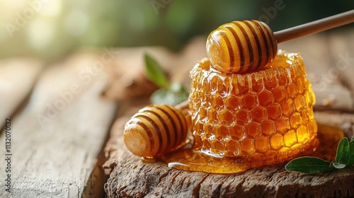 Golden Honeycomb with Dripping Honey and Wooden Dipper on Wooden Surface in Natural Setting Surrounded by Green Leaves and Soft Lighting