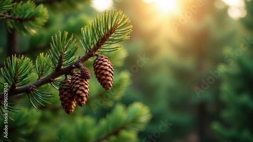 Golden Hour Cones on Evergreen Branch A Close-Up View of Nature's Beauty
