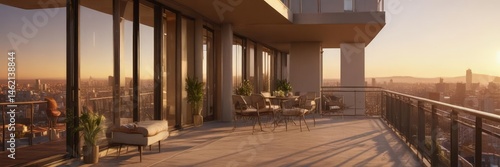 Golden hour illuminates sleek high-rise apartment, spacious balcony , bedroom, sun, city