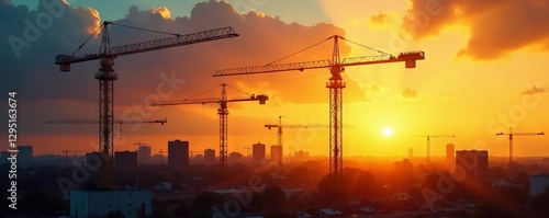 Golden hour light bathes active construction zone, cranes loom large against dramatic sunset, progress, horizon, tools
