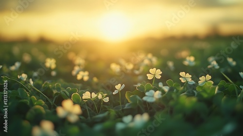 Golden Hour Meadow: A Serene Sunset Embrace of White Clover Blossoms