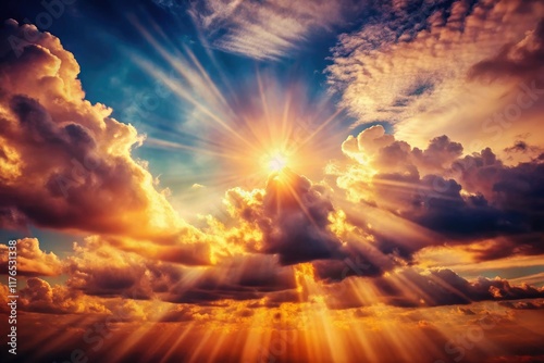 Golden hour sunburst, vintage cloudy sky. AI-generated retro wallpaper, radiant and nostalgic.