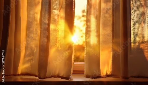 Golden Hour Sunlight Through Window: The sun's gentle embrace filters through sheer curtains, painting the room with a warm, inviting glow. Witness the soft light.