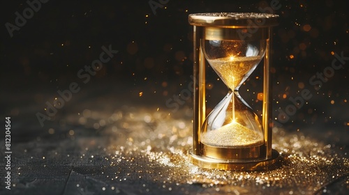 Golden hourglass with sparkling sands, symbolizing passing time, urgency, history. Magical. Vintage concept of measuring fleeting moments. Luxurious, classic timepiece.