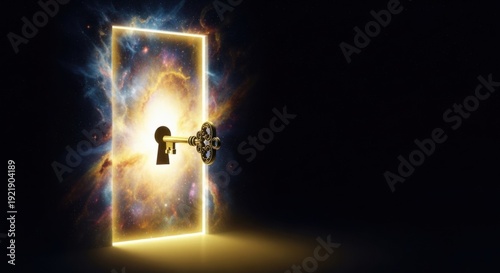 Golden key opening glowing cosmic doorway to new universe