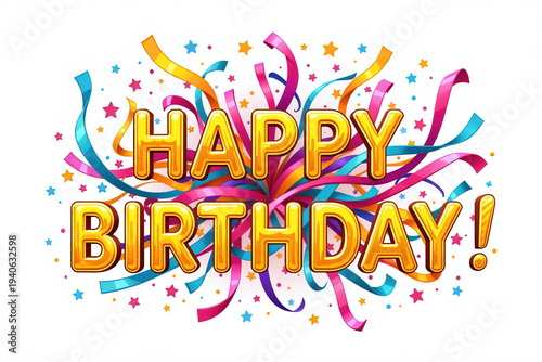 Golden letters with colorful ribbons and stars on white background celebrate birthday.