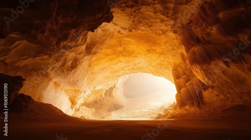Golden Light Emitting from a Cave Entrance, Illuminating the Rocky Interior