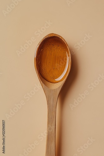 Golden liquid in a wooden spoon on beige background.