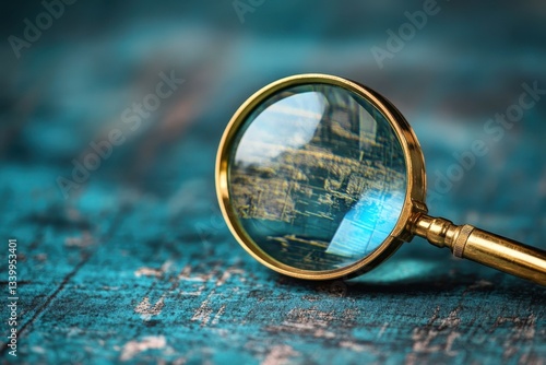 Golden magnifying glass over a textured blue surface, reflection of buildings. Good for illustrating research, investigation, or detailed scrutiny concept.