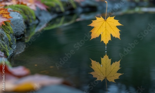 Golden maple leaf afloat on still water, reflection below, dark background, autumn