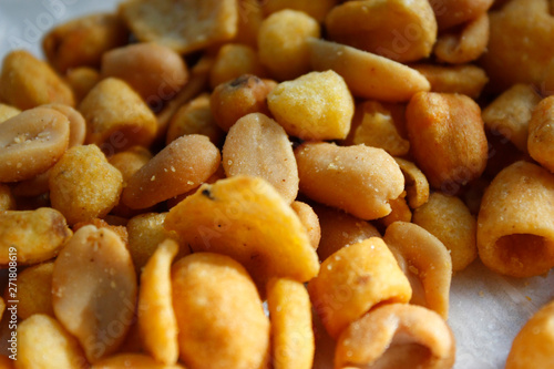 Golden mixed nuts, snacks, chips for beer close-up with selective focus.