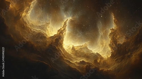 Golden nebulae, cosmic landscape, swirling, luminous, celestial formations