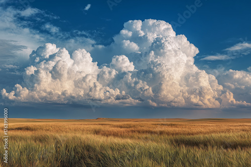 Golden prairie under towering cumulus clouds: dramatic expansive grassland landscape with billowing white clouds and deep blue sky