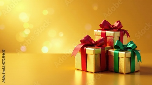 Golden Presents with Festive Bows on Yellow Background