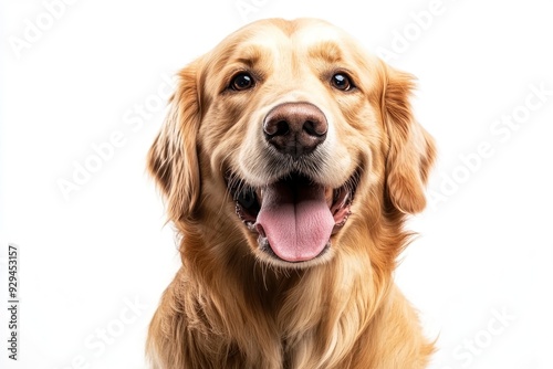 Golden Retriever dog - Canis lupus familiaris - great popular family domestic animal good with children isolated on white background tongue out while , ai