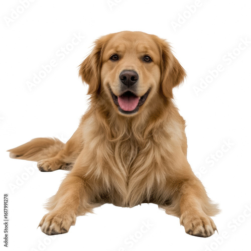 Golden retriever dog lying down and smiling on white background