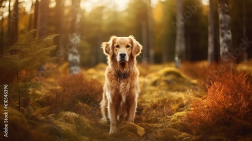 Golden retriever standing in the forrest. Generative AI.