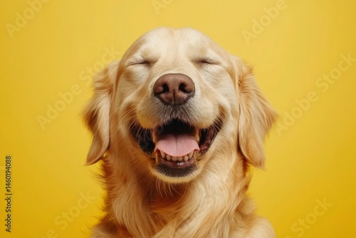 Golden retriever with eyes closed and mouth open, set against a bright yellow background