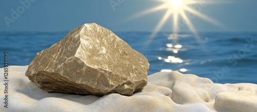 Golden rock on beach, ocean sunset backdrop, nature imagery