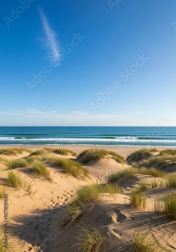 Golden sand dunes meeting the azure ocean under a vast blue sky panorama