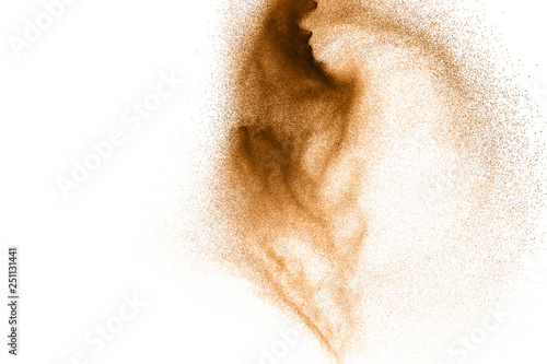 Golden sand explosion isolated on white background. Abstract sand cloud. Gold sand splash against on clear background. Sandy fly wave in the air.