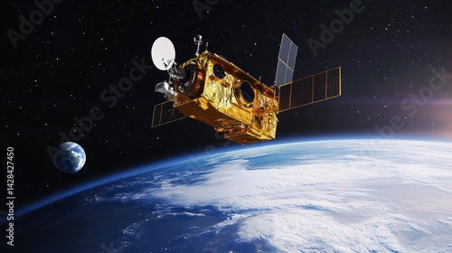 Golden Satellite Orbiting Earth and Moon