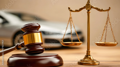 Golden scale of justice, wooden gavel and a car model on the dark background. lawyer services, division of property, mortgage, real estate auction. legal consultation, criminal car sale, property low
