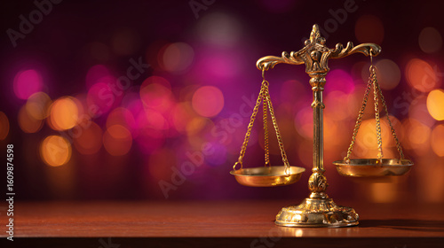 Golden Scales of Justice on Wooden Table with Bokeh Background