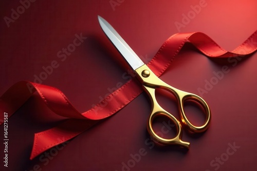 Golden scissors slicing red ribbon, high angle , retail, shiny