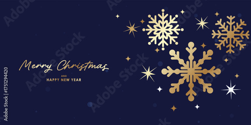 Golden snowflakes for Christmas and New Year luxury greeting card dark blue background design