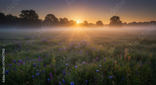 Golden Sunrise, Foggy Field, Blooming Wildflowers