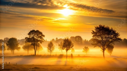 Golden sunrise over a serene landscape with a few silhouetted trees and a misty atmosphere, horizon, silhouette, horizon
