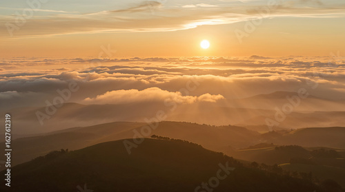 Golden sunset illuminates rolling hills shrouded in mist, with a sea of clouds below and sunbeams piercing through the atmospheric haze.