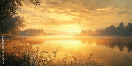Golden sunset over a misty lake.