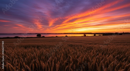 Golden Sunset Over Wheat Field and Calm Lake - Serene sunset landscape; golden wheat field meets tranquil lake under vibrant sky. Symbolizes peace, abundance, tranquility, nature's beauty